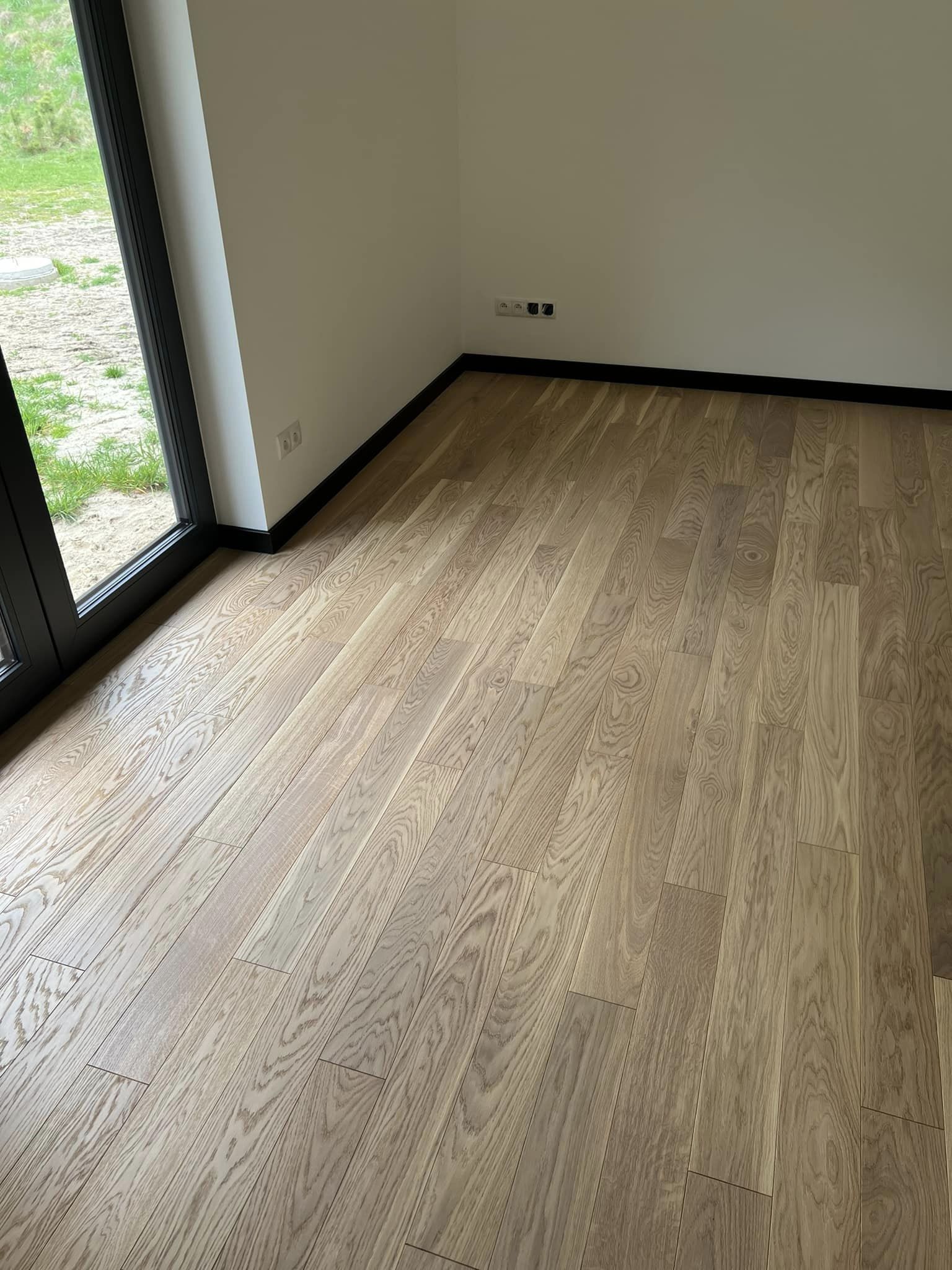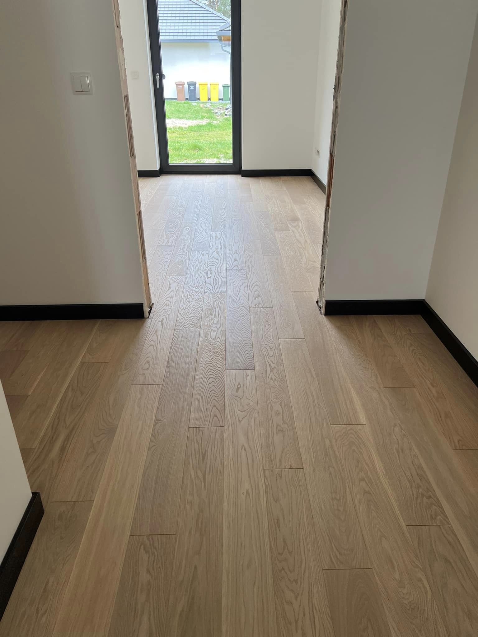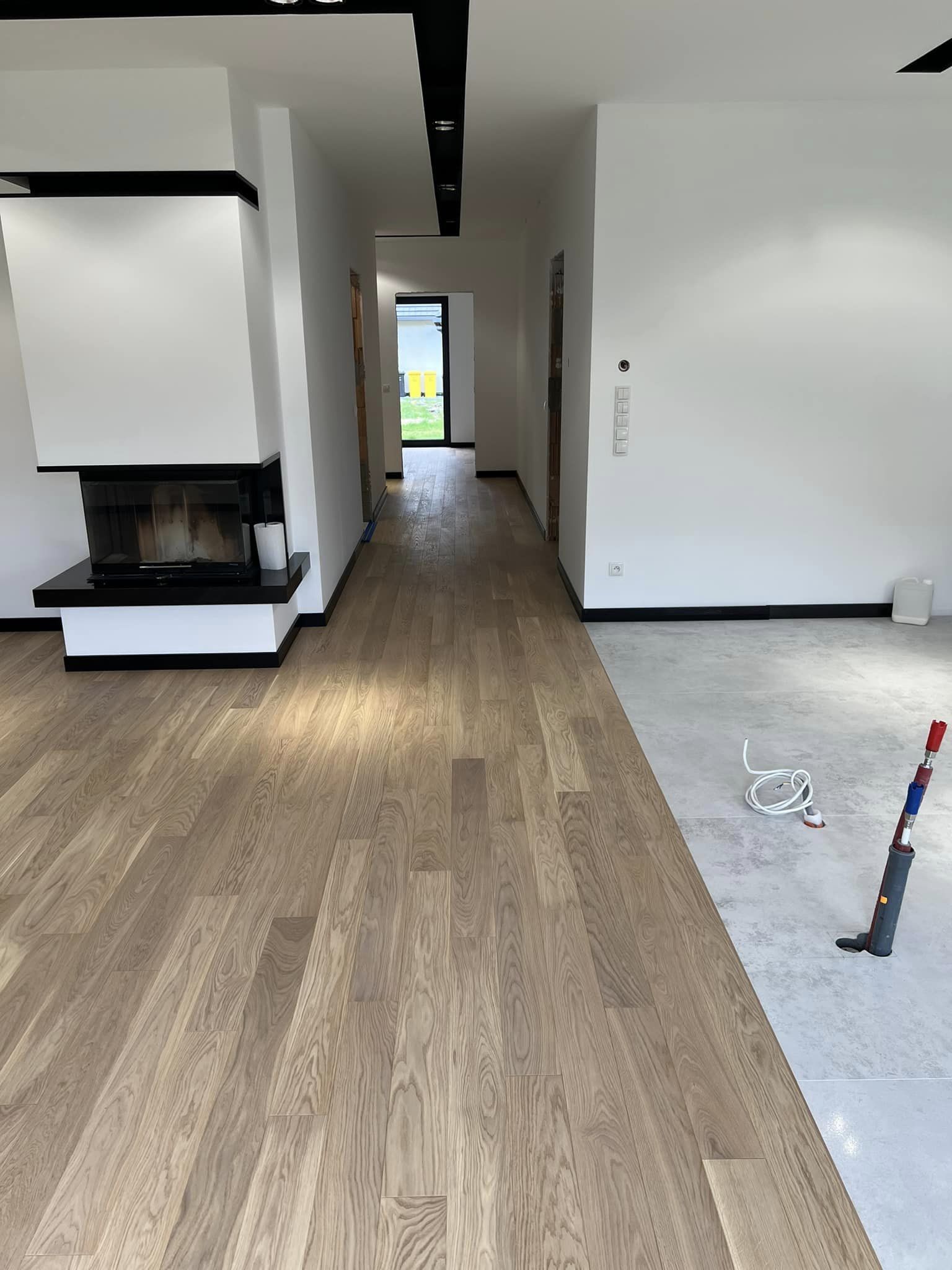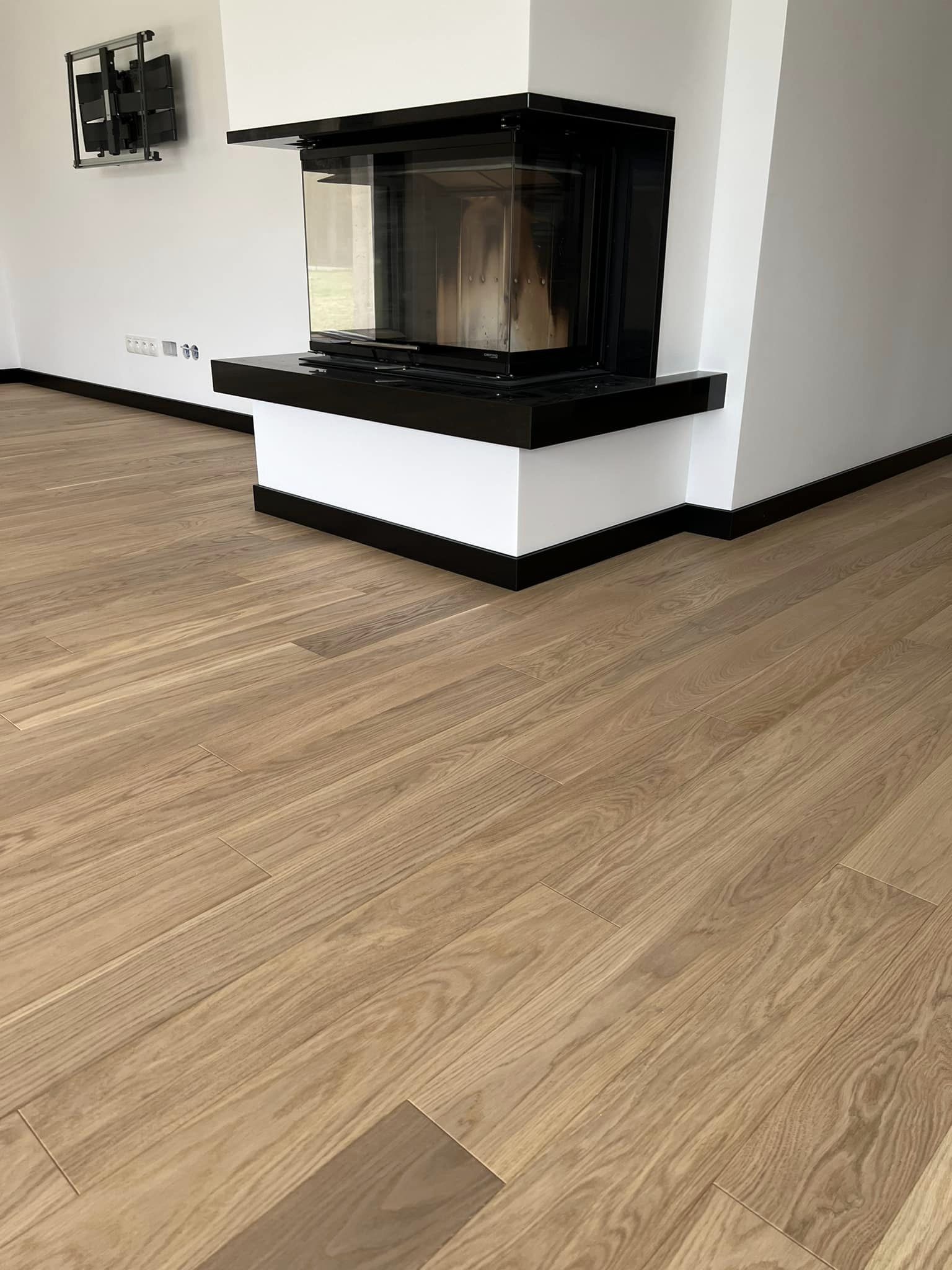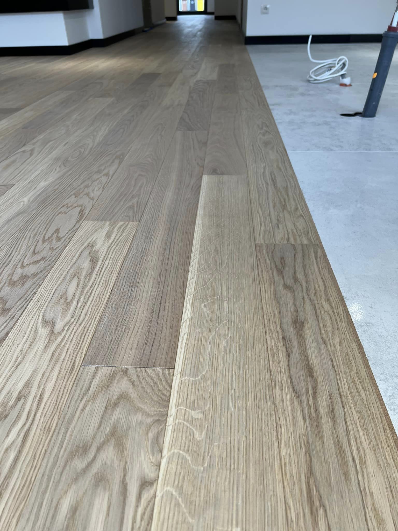 Montaż deski dwuwarstwowej dąb zamontowana na wodne ogrzewanie podłogowe, fazowana czterostronnie oraz szczotkowana. Do całości listwa rdzeniowa Cubu Flex. Od odpowiedniego przygotowania podłoża po kompleksowy montaż. Sprzedaż, montaż, doradztwo.