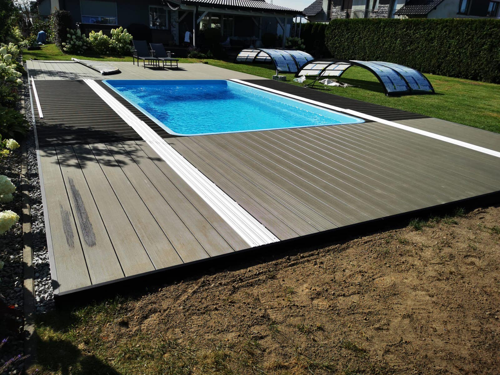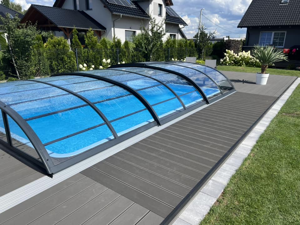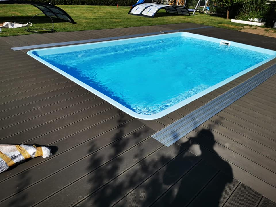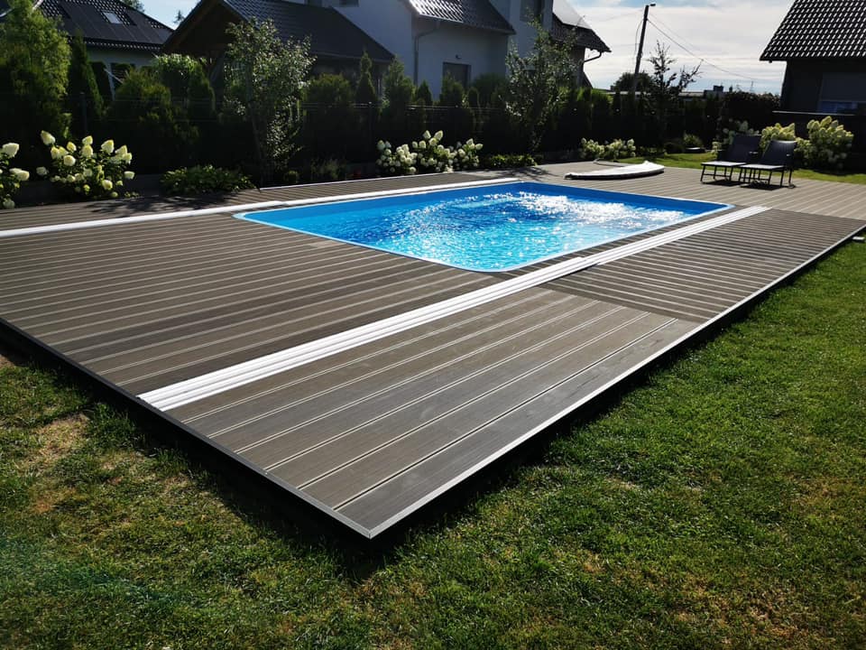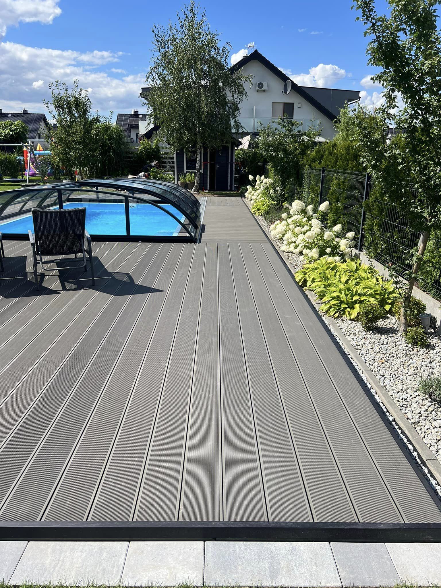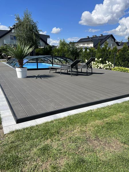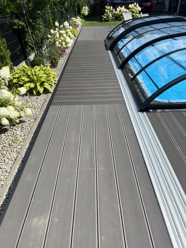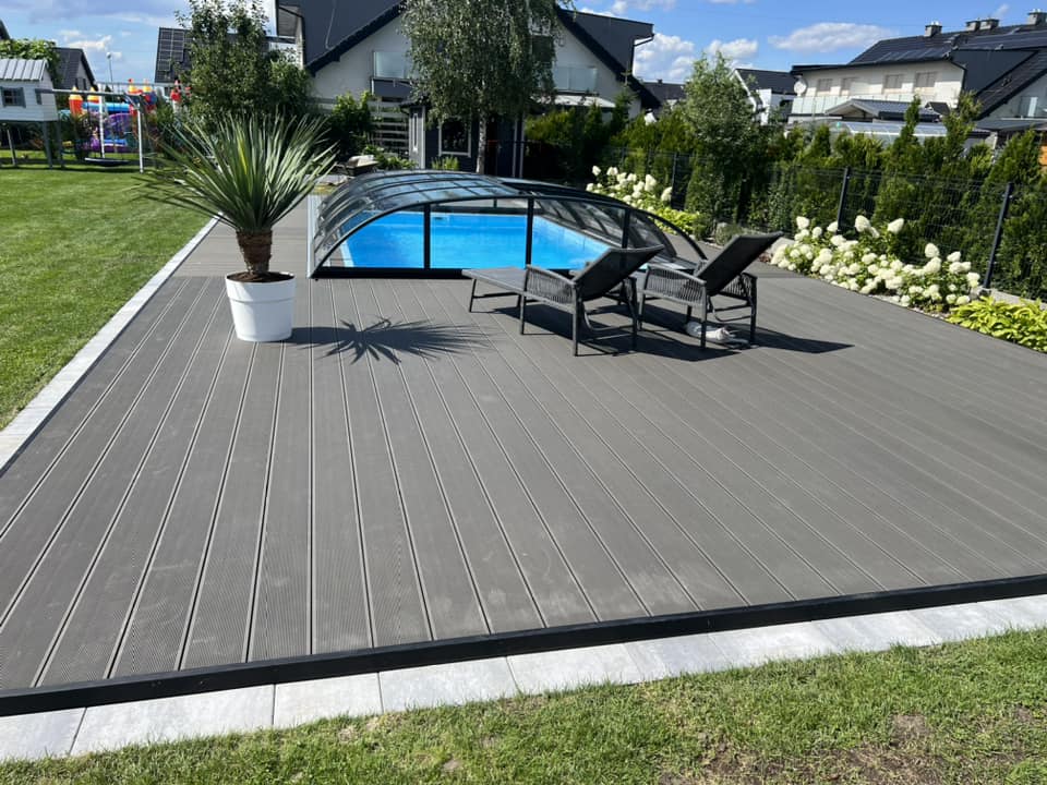 Kompleksowa budowa tarasu z deski kompozytowej Twinson na konstrukcji aluminiowej. Taras kompozytowy wykonany na gruncie na konstrukcji aluminiowej. Deska tarasowa Twinson Essential XL w kolorze Antracytowym.